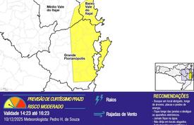 A previsão de curto prazo divulgada pela Defesa Civil estadual, válida até as 16h23, aponta temporais isolados, que podem ocasionar raios, rajadas de vento, granizo e alagamentos pontuais.