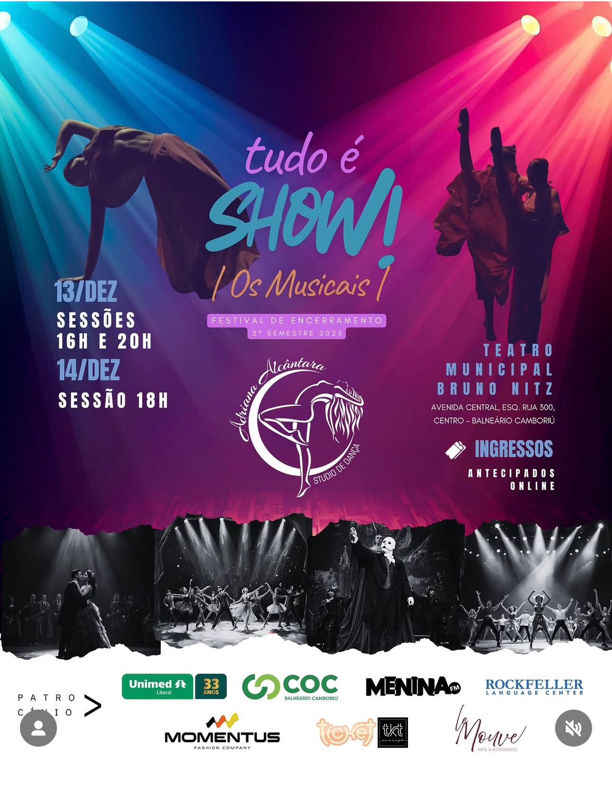 O espetáculo de dança “Tudo é Show! Os Musicais” estará em cartaz no Teatro Municipal Bruno Nitz, em Balneário Camboriú, neste fim de semana. Serão duas sessões no sábado (13), às 16h e 20h, e uma no domingo (14), às 18h. Os ingressos estão à venda pelo site www.ticketideal.com.br .