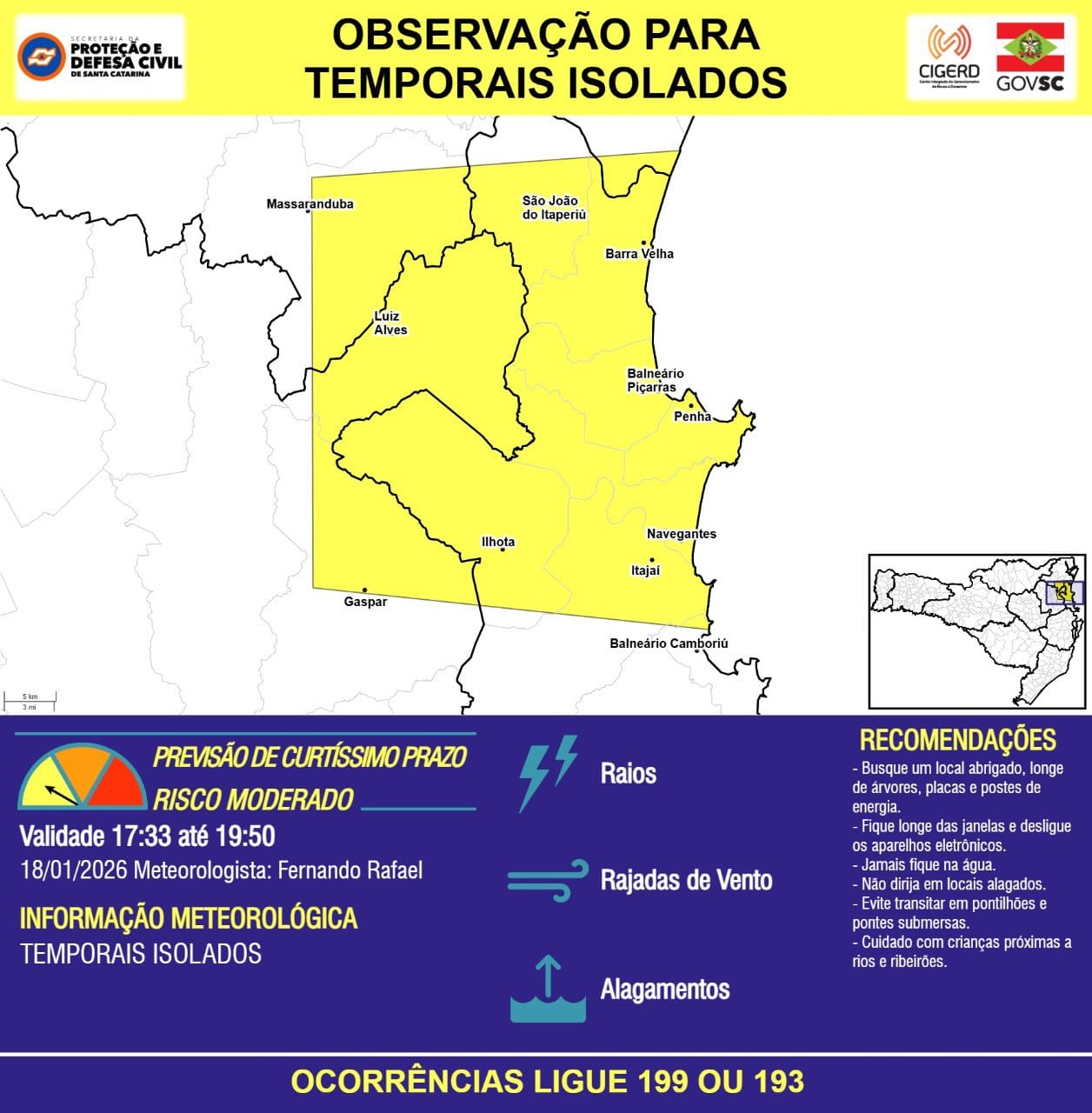 A Prefeitura de Balneário Camboriú, por meio da Defesa Civil, alerta a população para a previsão de temporais isolados neste domingo (18), conforme aviso emitido pela Defesa Civil de Santa Catarina.