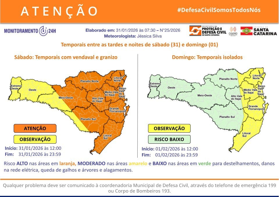 A Defesa Civil de Balneário Camboriú reforça o alerta da Secretaria de Proteção e Defesa Civil de Santa Catarina para a possibilidade de temporais com vendaval e granizo neste sábado (31) no município. Os temporais devem ganhar força a partir da tarde, e a cidade está em alerta laranja das 12h às 23h59.
