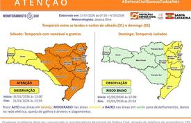 Já no domingo (1), o risco é baixo a moderado para ocorrências associadas a alagamentos e enxurradas pontuais, queda de galhos e árvores e danos na rede elétrica. Balneário Camboriú encontra-se em observação das 12h às 23h59.
