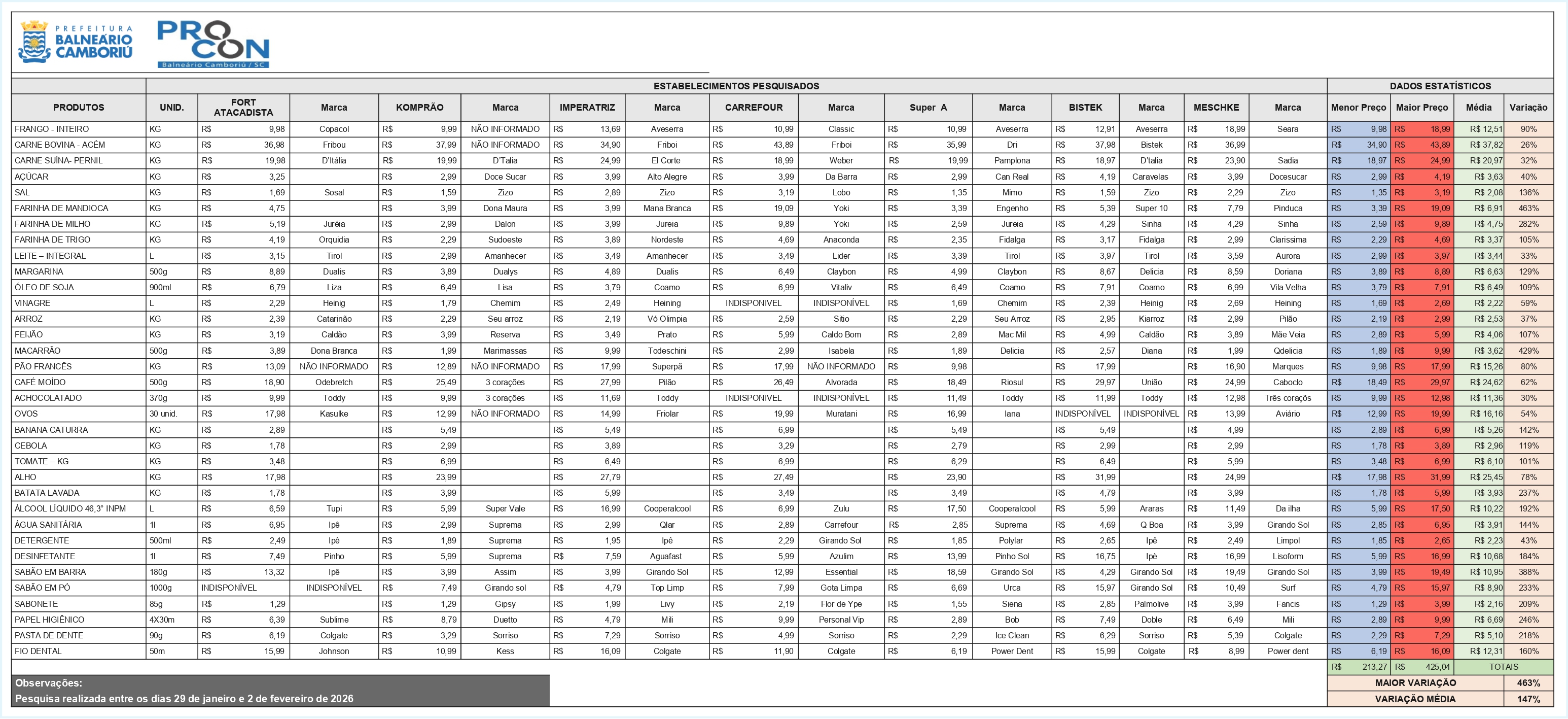 O Procon de Balneário Camboriú divulgou o resultado da pesquisa mensal dos preços da cesta básica referente ao mês de fevereiro de 2026. O levantamento foi realizado entre os dias 29 de janeiro e 2 de fevereiro em sete supermercados da cidade (Fort Atacadista, Komprão, Imperatriz, Carrefour, Super A, Bistek e Meschke), e considerou os preços de 34 itens essenciais, entre alimentos, produtos de higiene e limpeza.