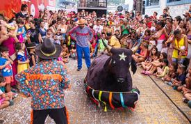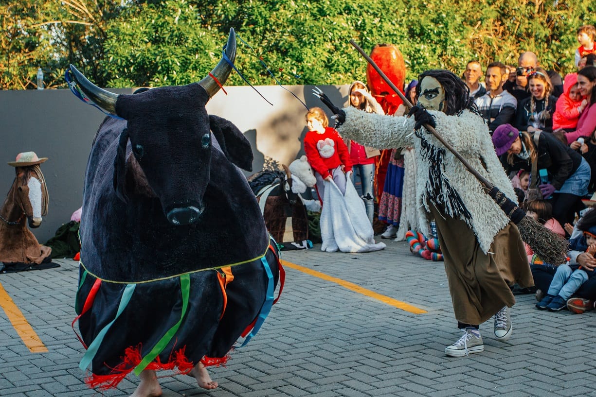 Herança da cultura açoriana, o Boi-de-Mamão é um espetáculo cênico-musical que reúne teatro, música, dança e personagens simbólicos como Mateus, Bastião, Maricota, Doutor, Vaqueiro e a Bernunça. A narrativa central gira em torno da morte e da ressurreição do boi, trazendo elementos de humor, crítica social e memória coletiva, transmitidos de geração em geração.