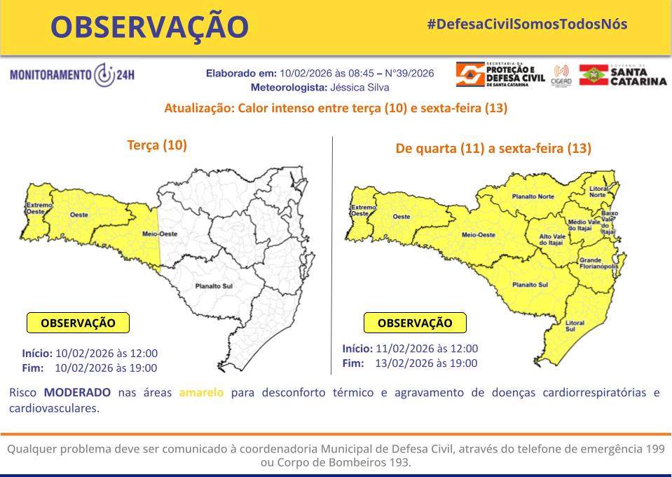 A previsão está alinhada com o cenário registrado em Santa Catarina, que vem enfrentando dias de calor forte e tempo abafado, com possibilidade de pancadas de chuva típicas do verão.