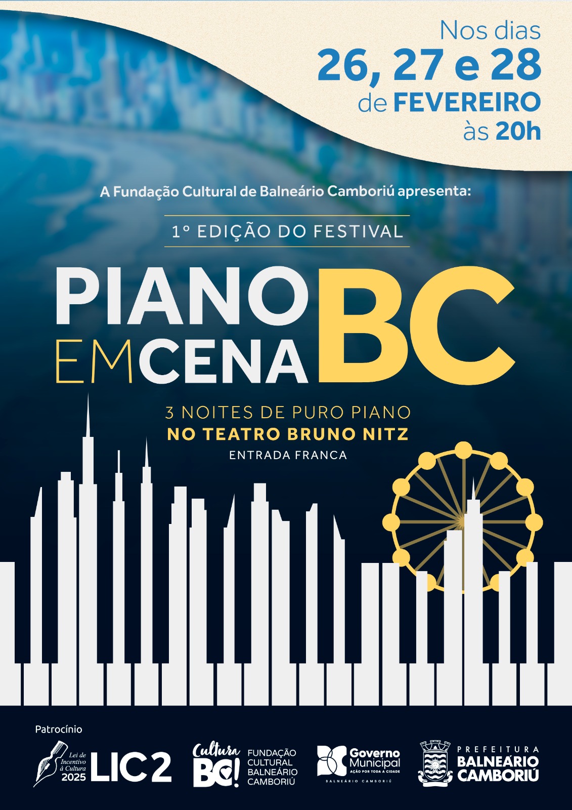 O Festival Piano em Cena BC começa nesta quinta-feira (26) no Teatro Municipal Bruno Nitz, em Balneário Camboriú, com uma programação gratuita que inclui concertos e oficinas. Patrocinado pela edição especial da Lei Municipal de Incentivo à Cultura, a LIC II, o evento segue até sábado (28), com apresentações musicais nas três noites, a partir das 20h.