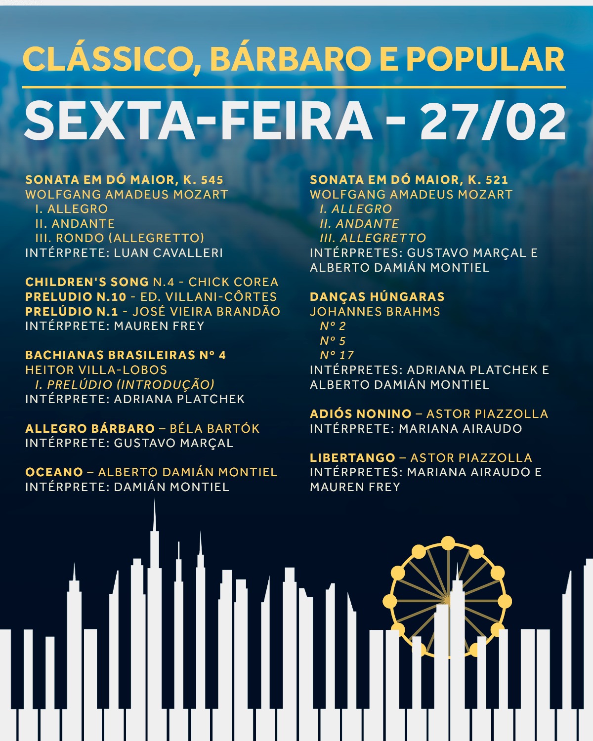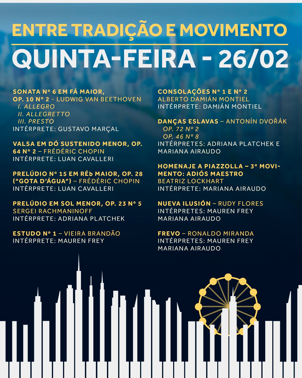 O primeiro concerto destacará o diálogo entre tradição e movimento, conectando o repertório clássico europeu a ritmos e danças de diferentes culturas. O segundo vai explorar contrastes entre o clássico, o popular e o contemporâneo, revelando identidades musicais distintas. Já o concerto de encerramento vai propor uma experiência poética e sensorial, marcada por contrastes de luz e sombra, atmosferas impressionistas e narrativas dramáticas, reafirmando o piano como instrumento múltiplo e atual. Os ingressos gratuitos podem ser reservados pelo site https://www.sympla.com.br.