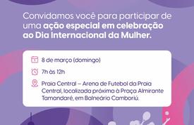 A Prefeitura de Balneário Camboriú, por meio da Secretaria de Assistência Social, Mulher e Família e da Fundação Municipal de Esportes (FME), promove, neste domingo (8), evento comemorativo ao Dia Internacional da Mulher. Com o tema #elasmovemBC, a iniciativa vai oferecer atividades gratuitas, das 7h às 12h, na Praia Central (arena de futebol/altura da Praça Almirante Tamandaré na Avenida Atlântica).