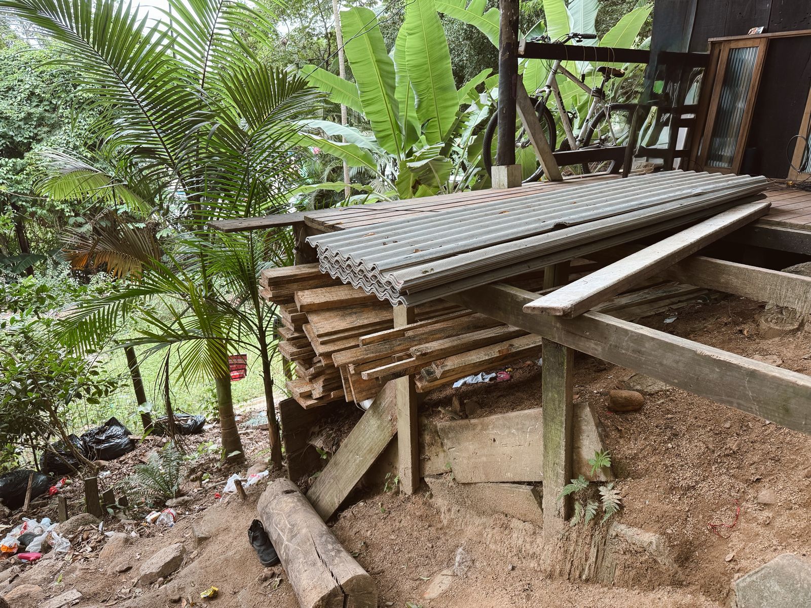 No local, foi constatada a presença de um casal e um cachorro da raça pitbull. A estrutura da residência já contava com vigas de sustentação e parte do assoalho concluída. Além disso, havia uma grande quantidade de lixo, incluindo três colchões.