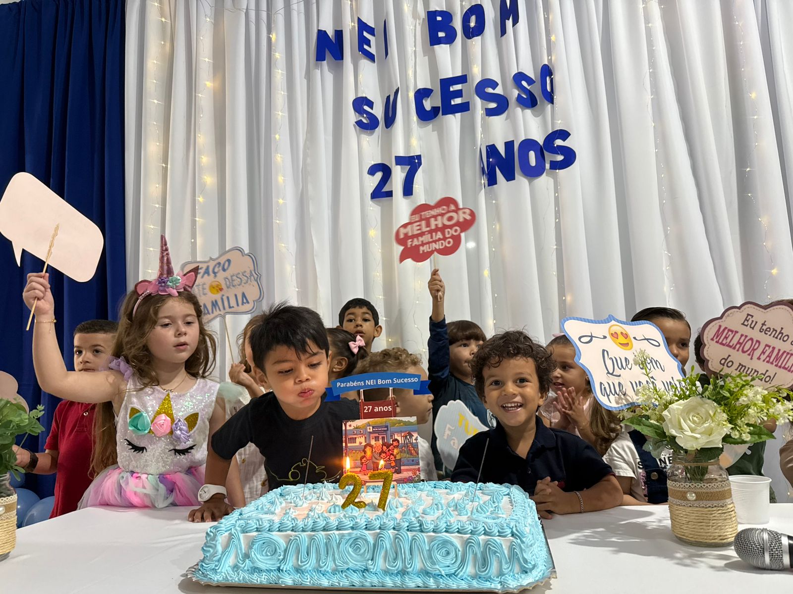O NEI Bom Sucesso também aproveitou a ocasião para dar início às comemorações de seus 27 anos de história, com um momento especial de parabéns, bolo e confraternização entre famílias e equipe escolar.