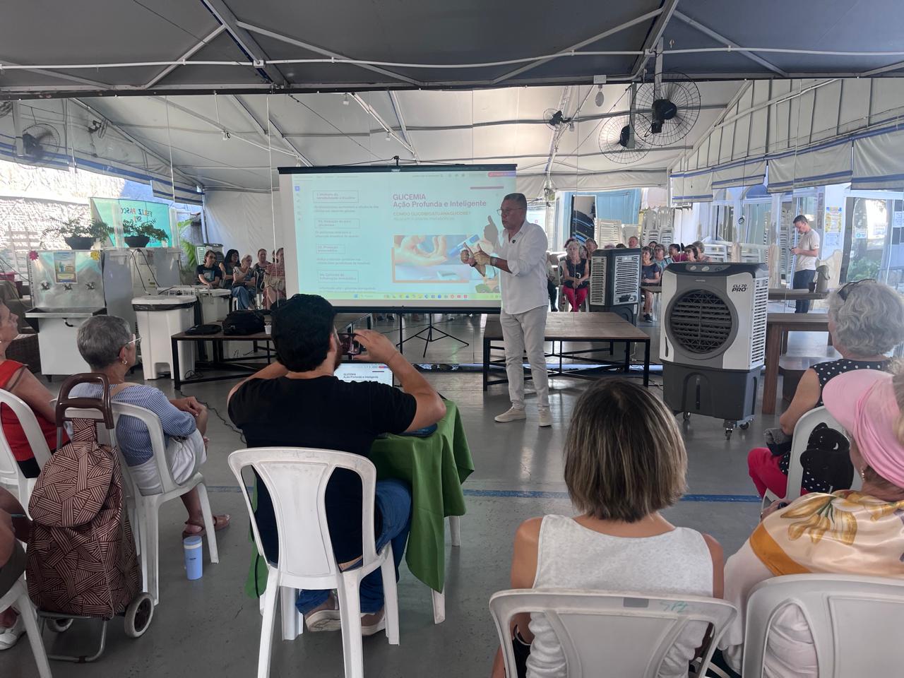 A palestra foi ministrada pelo consultor Alberto Soares e o terapeuta Alexandre Araújo, que esclareceram dúvidas importantes para a saúde e o bem-estar dos idosos, como dores no corpo e articulações, ansiedade, depressão, libido, TPM, emagrecimento e varizes, além de orientações e esclarecimentos sobre os benefícios do Cone Hindu, Reiki e Bandagem Auricular.